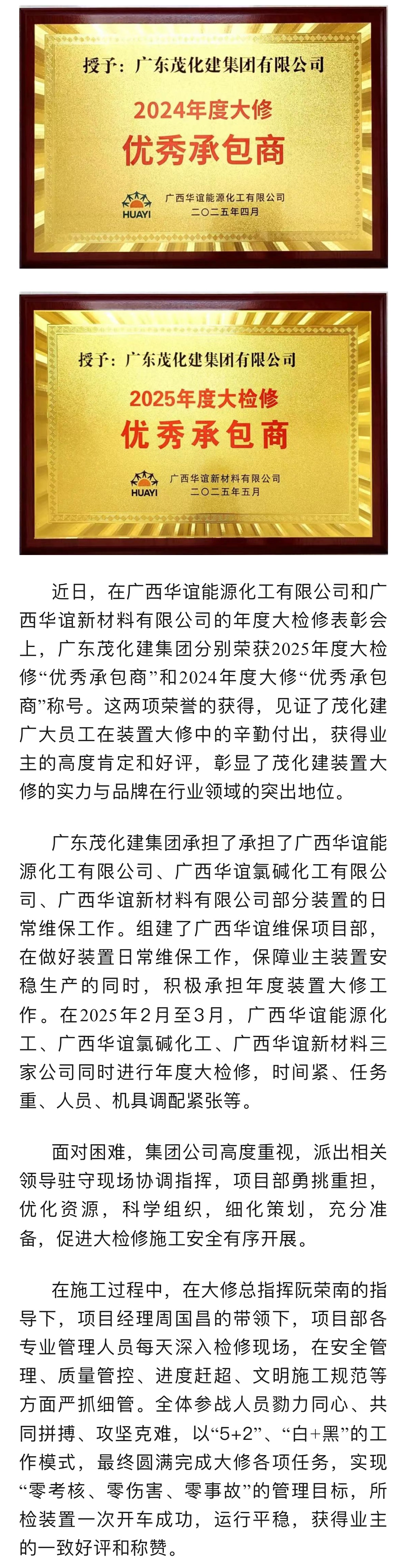 雙喜臨門(mén)|茂化建榮獲廣西華誼能源化工、新材料大修優(yōu)秀承包商稱(chēng)號(hào)