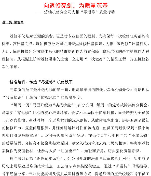煉油機修分公司力推“零返修”質量行動