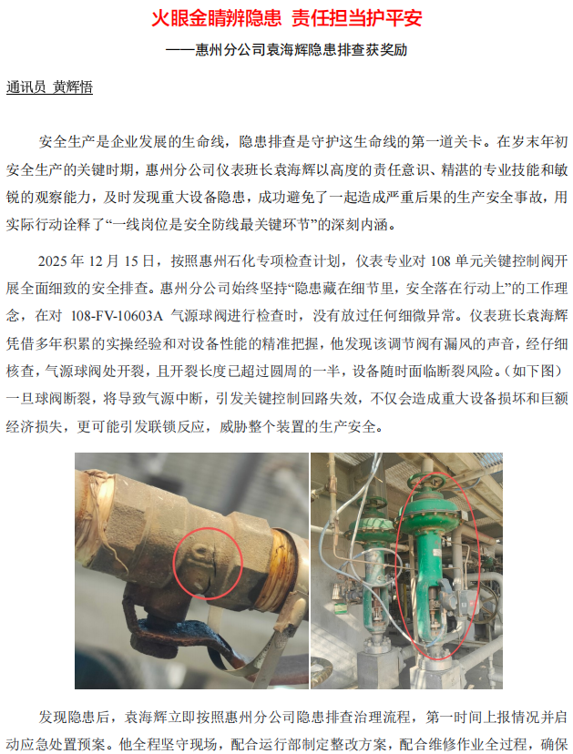 惠州分公司袁海輝隱患排查獲獎(jiǎng)勵(lì)